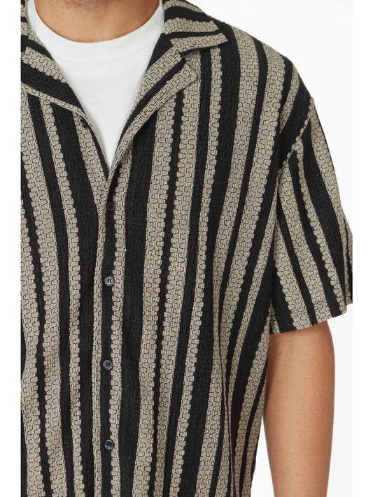 Textured Black with Tan Stripe Short Sleeve Button Down