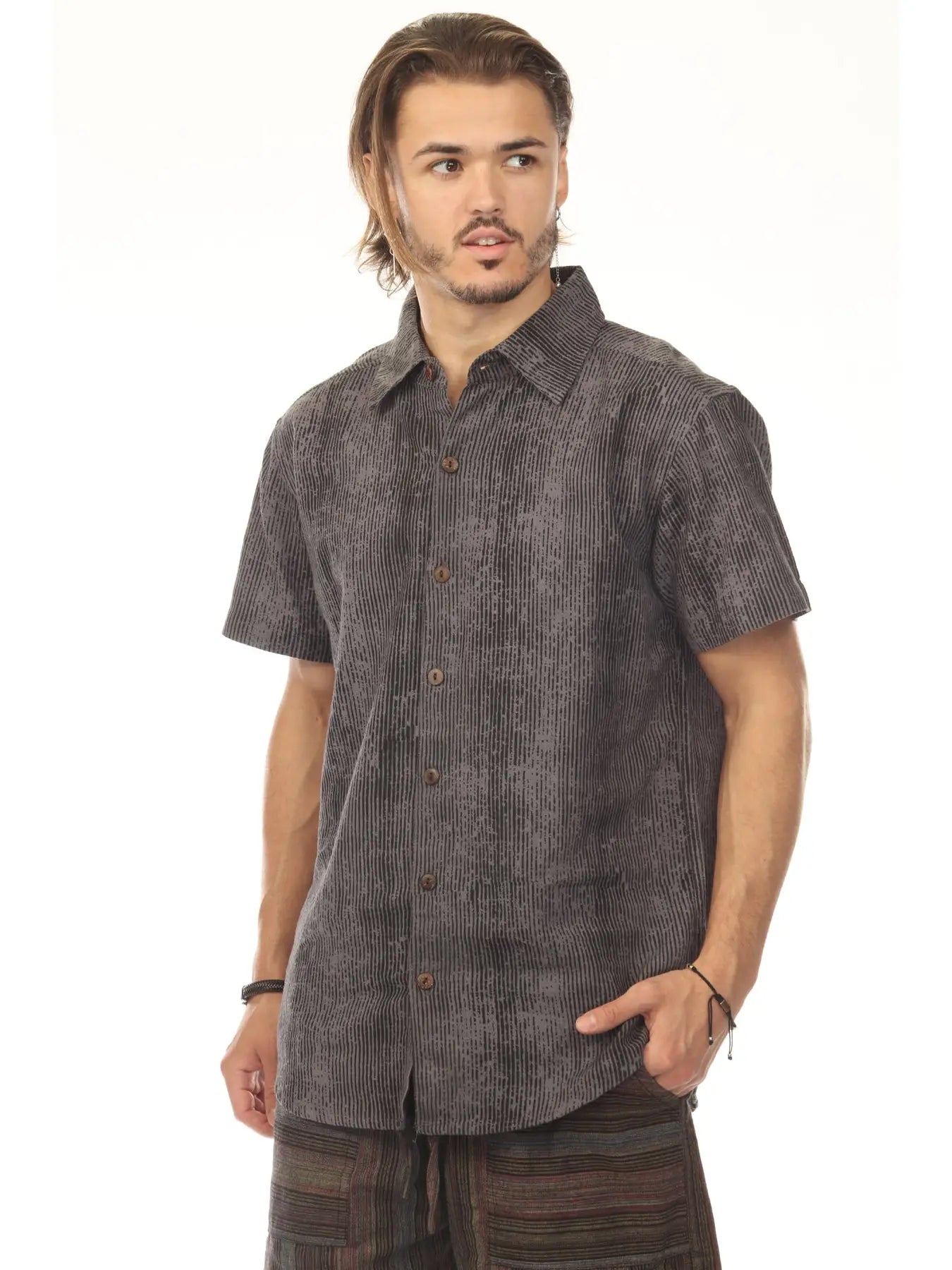 The Vibration Stripe Short Sleeve Shirt blends relaxed structure with everyday versatility. Crafted from 100% cotton, this lightweight button-down features a subtle stripe texture and a soft, breathable feel that works year-round. Designed with a classic collar and short sleeves, it’s easy to dress up or down, making it a go-to piece for casual days, travel, or laid-back evenings. Finished with a clean silhouette and natural drape for effortless wear.